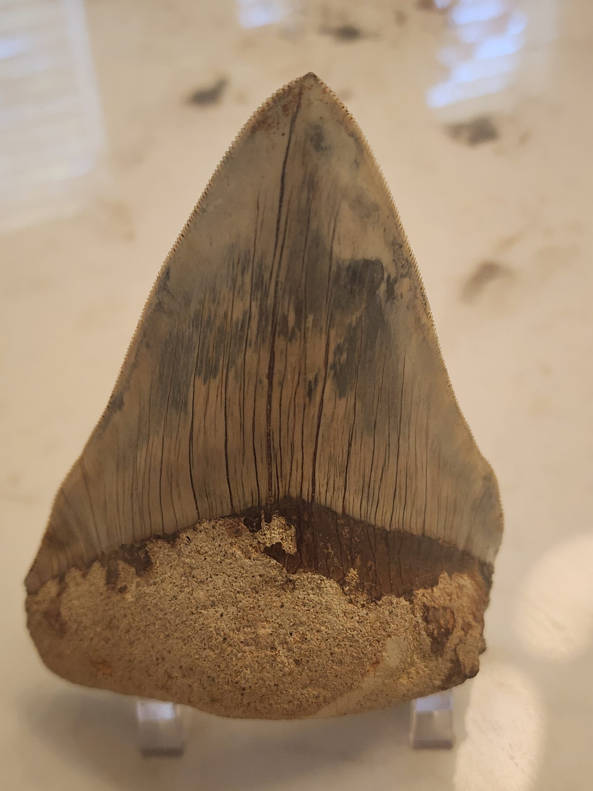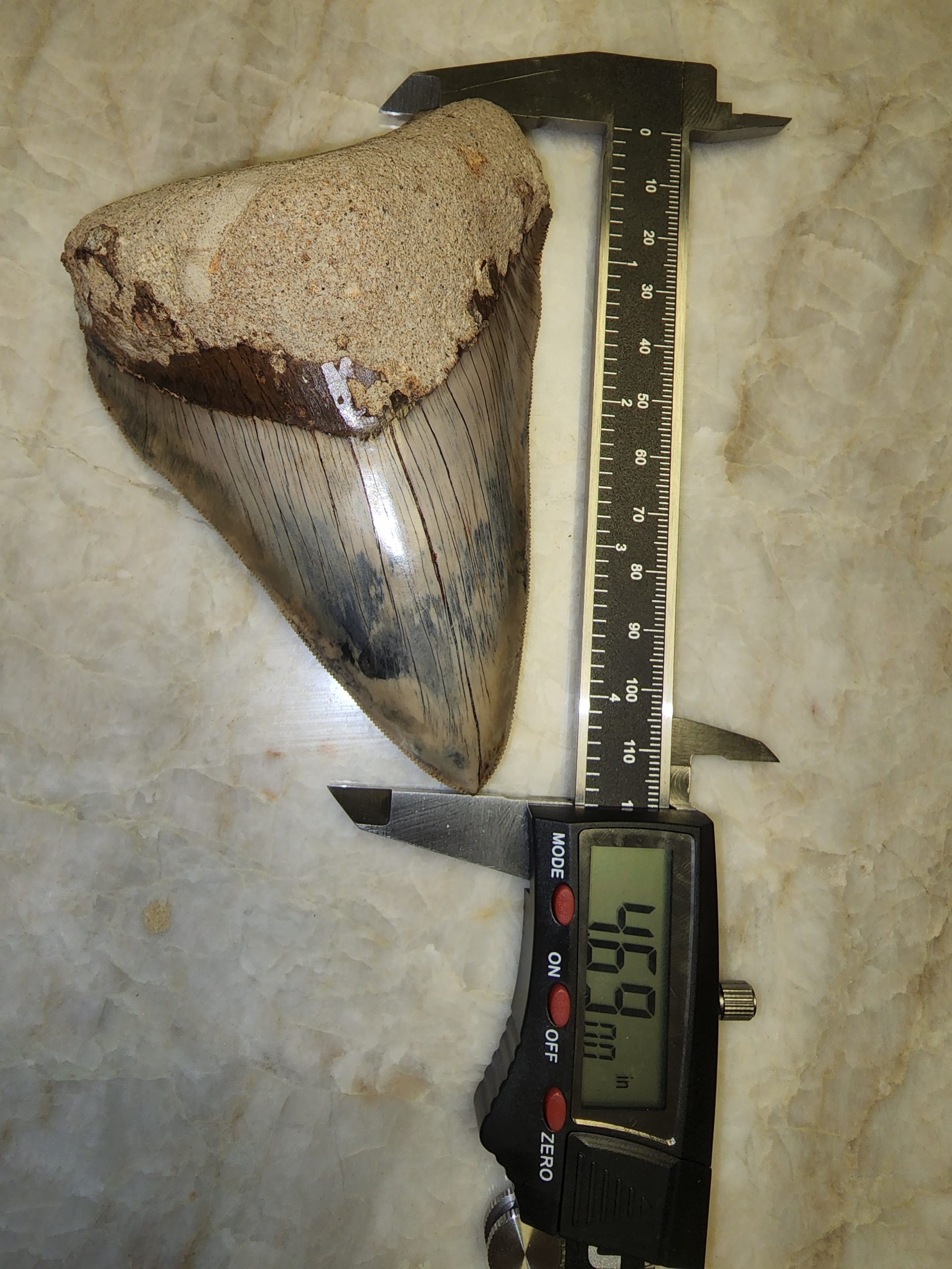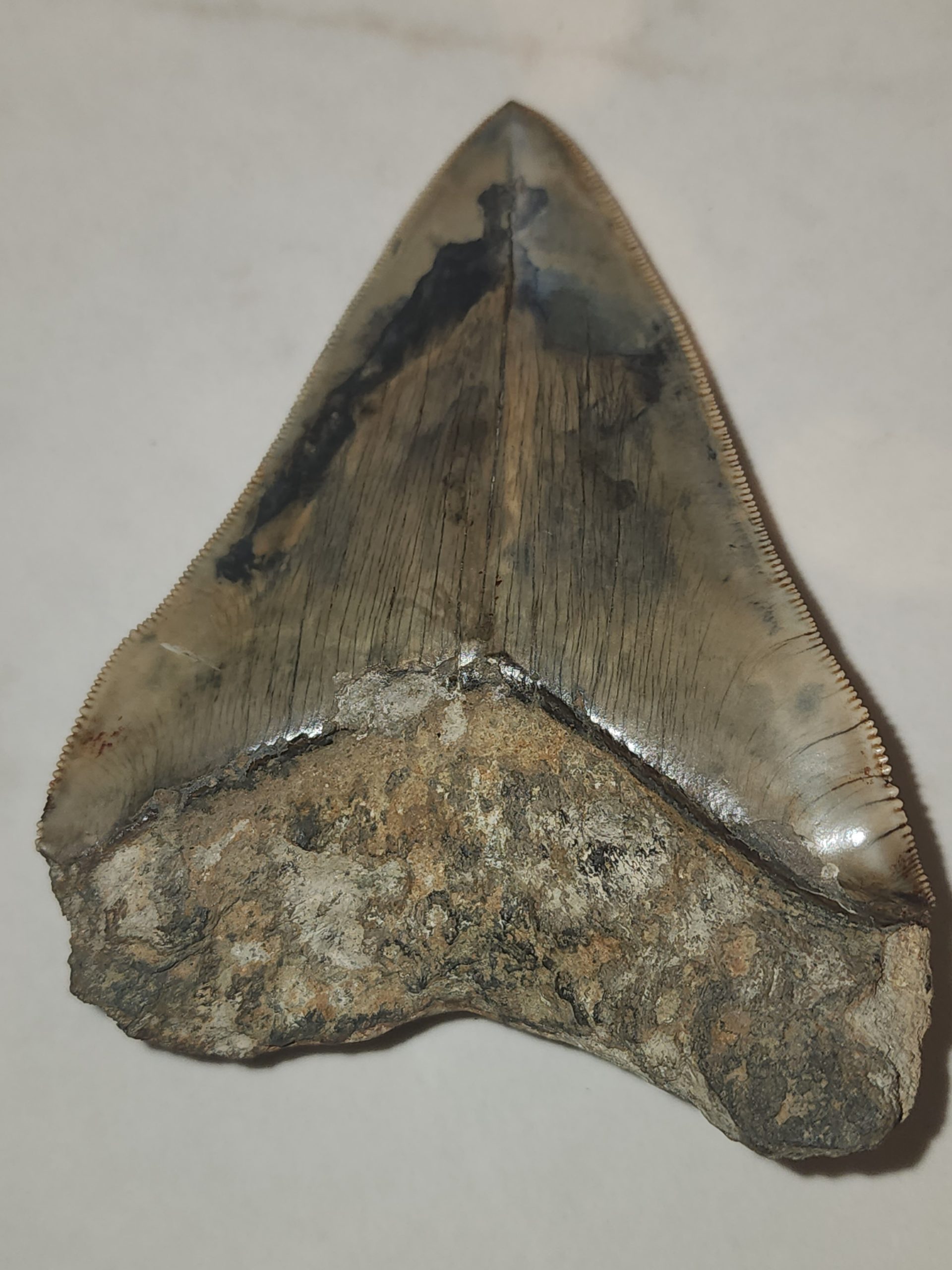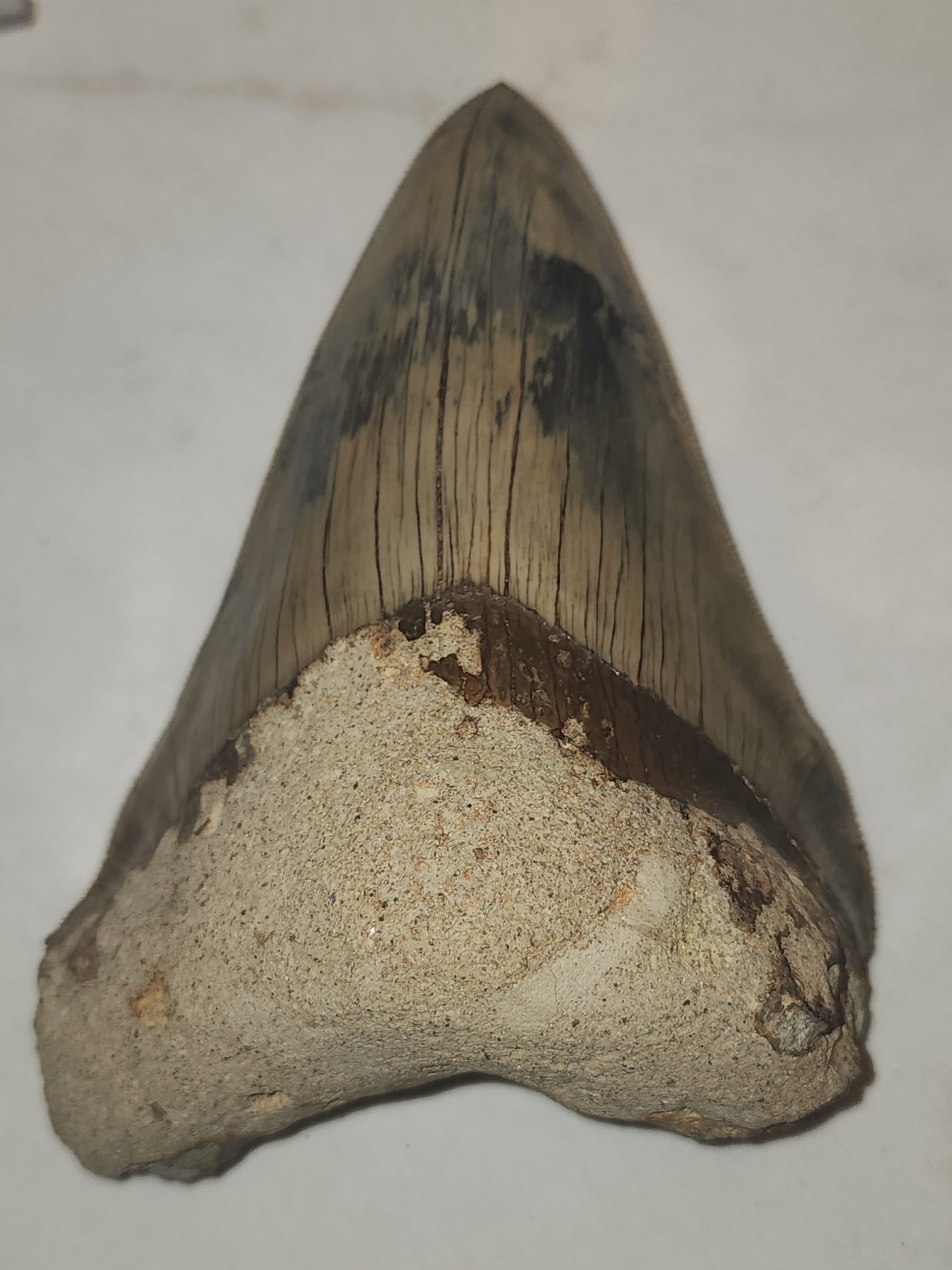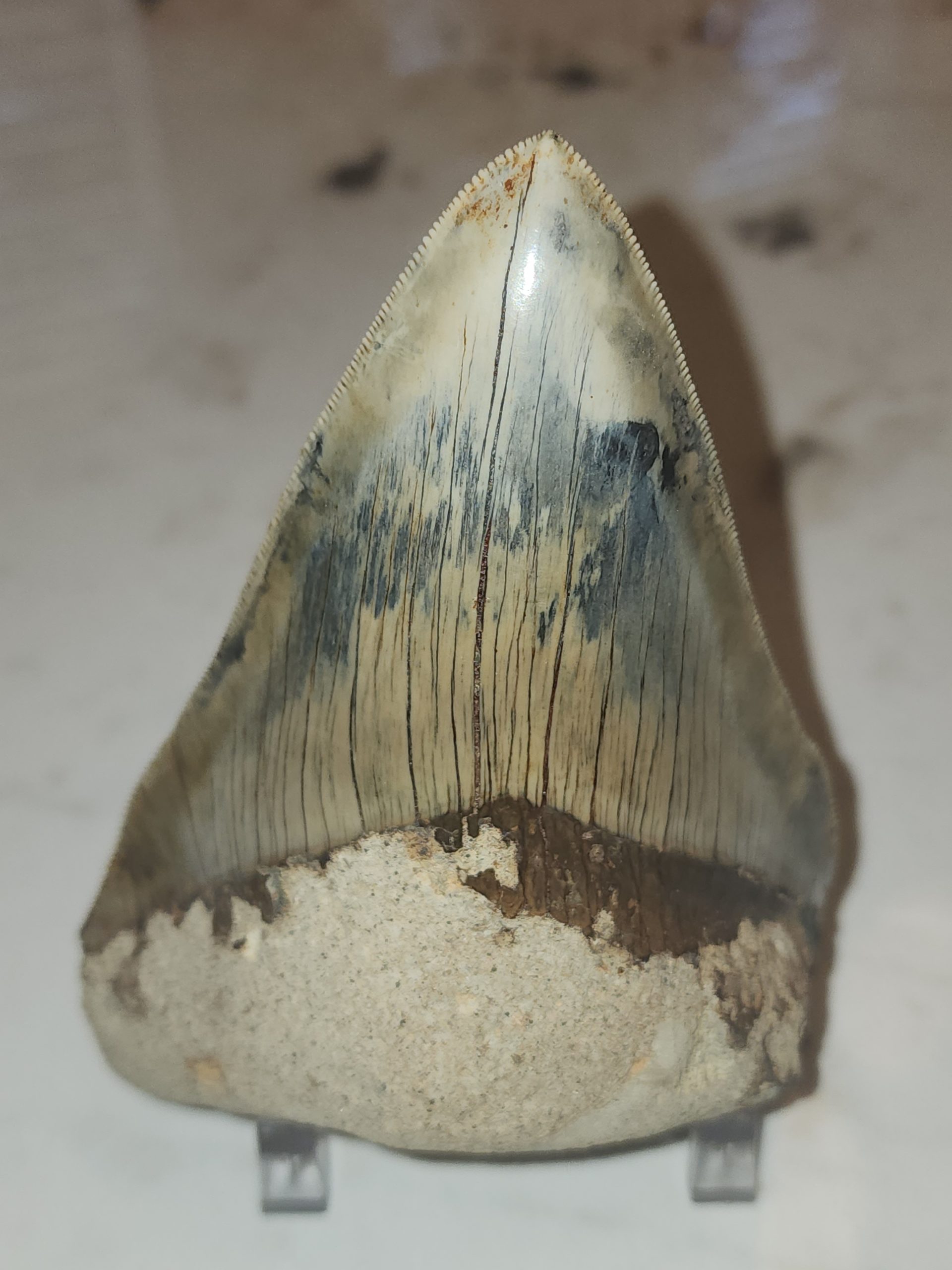 CollectiblesThis is a museum-quality, 100% authentic Megalodon tooth, featuring exceptional preservation and natural beauty. The tooth is very large (4.69 inches), fully intact with strong enamel, sharp serrations, and a complete root, making it an outstanding specimen for serious collectors.